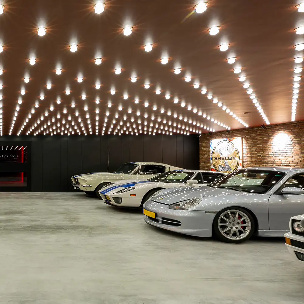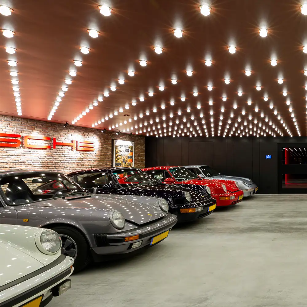 Für dieses Projekt realisierten wir ein Beleuchtungskonzept, das den Anforderungen des Kunden voll entsprach. Die Decke in der Garage besteht aus 800 pulverbeschichteten Strahlern in oxidroter Farbe, die einzeln steuerbar sind und sowohl statische als auch dynamische Effekte bieten. Darüber hinaus wurden verschiedene Lichtspiele programmiert, die mit dem Hausautomationssystem verbunden sind und für zusätzliche Flexibilität und Atmosphäre sorgen.